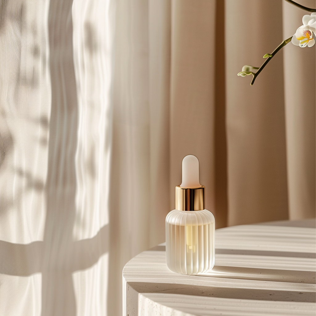 GPT -> luxury skincare serum bottle placed on a white vanity table, high-end cosmetic product, clean and minimal packaging, lifestyle photography, cozy home skincare setting, soft natural daylight coming through the window, medium shot, eye-level angle, slightly off-center composition, casual and realistic atmosphere, pastel color palette, warm and soft tones, subtle depth of field, everyday beauty moment, tidy but lived-in space, natural and effortless mood, professional lifestyle photography --ar 1:1 --v 6 --style raw --q 2