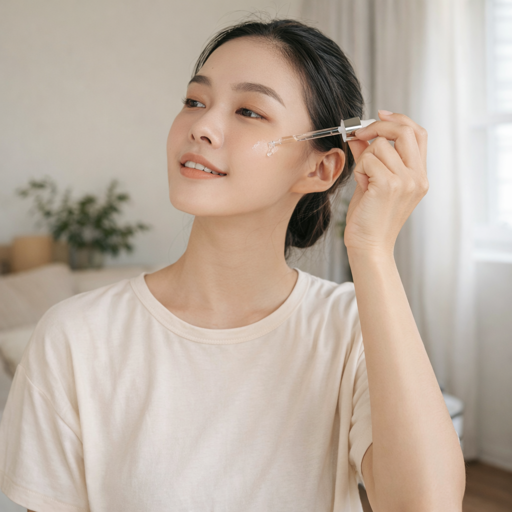 GPT -> asian woman using a luxury skincare serum bottle, elegant and refined appearance, high-end beauty lifestyle photography, premium skincare setting, natural daylight, soft and bright atmosphere, medium shot, eye-level angle, centered composition, clean background, subtle depth of field, pastel color palette, cheerful and fresh mood, healthy glowing skin, minimal and tidy environment, professional commercial beauty photography --ar 1:1 --v 6 --style raw --q 2