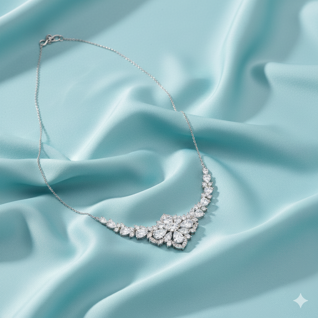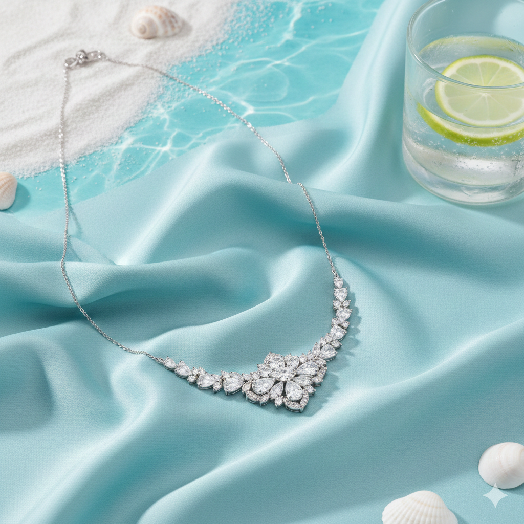 썸머 시즌 쥬얼리 사진을 만들어줘. 럭셔리 브랜드의 제품이야. 제품은 다이아목걸이야. 실크 위에 놓여있어. 고급진 느낌이 잘 살았으면 좋겠어. 사실적인 제품 사진 스타일, 여름이니까 시원하고 밝은 분위기, 탑뷰 45도 각도, 스튜디오 조명, 고급진 색상 톤, 배경은 심플하지만 여름의 느낌이 살짝은 느껴지도록 해줘. 1080x1920 사이즈로 해줘.