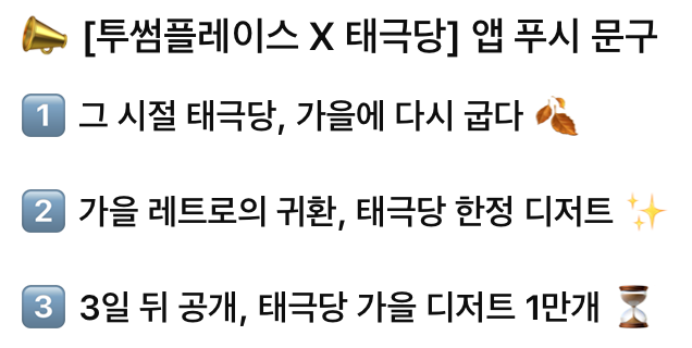 [투썸플레이스 X 태극당] 콜라보 디저트 출시 공지 앱 푸시 문구 3개.
