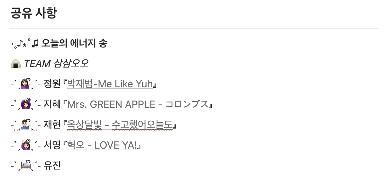 아!! 저희끼리 이야기하다가 혼자 자습할 때 오늘 들으면서 텐션을 제일 많이 올려준 곡 추천하는 거를 저녁스크럼 시간에 공유하기로 했어요.(저의 아이디어였답니다✌️) 팀원들과 조금이라도 더 재미있는 이야기 하고 싶은 마음 :-)